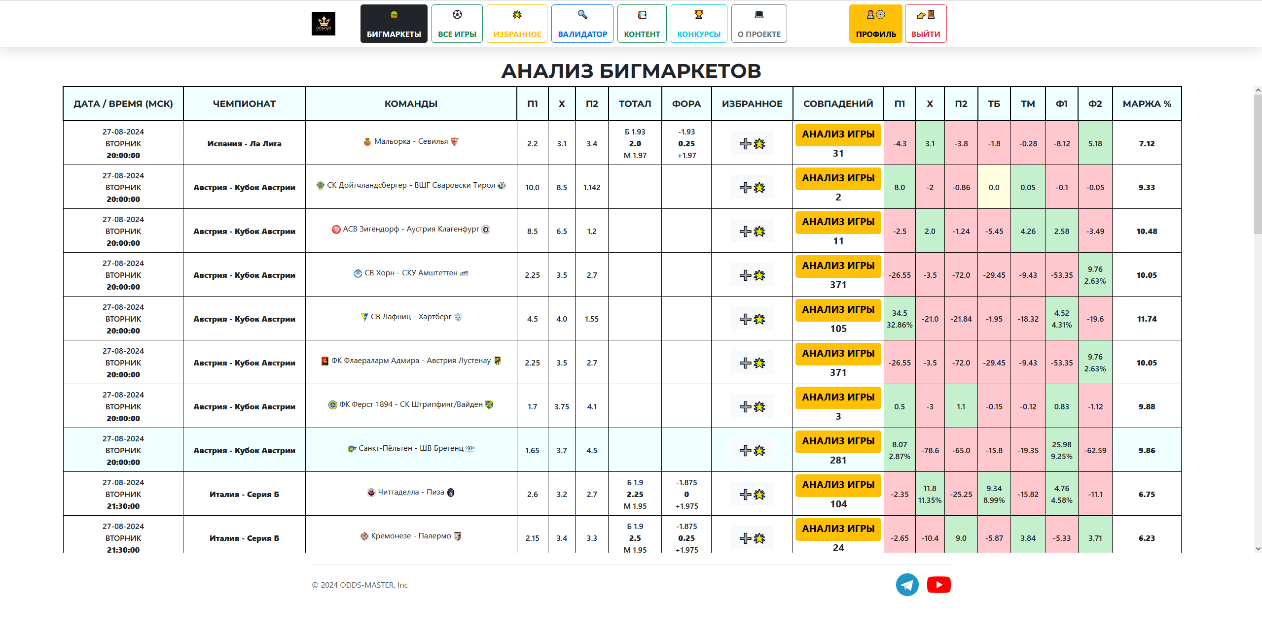 СЕРВИС СОДЕРЖИТ ИНФОРМАЦИЮ ОБО ВСЕХ СПОРТВНЫХ СОБЫТИЯХ С 2019 ГОДА (БОЛЕЕ 850.000 ИГР). СИСТЕМА ПОИСКА СОВПАДЕНИЙ, РАСЧЕТ УБЫТОЧНОСТИ ИЛИ ПРИБЫЛЬНОСТЬИ КАЖДОГО РЫНКА ПОЛНОСТЬЮ АВТОМАТИЗИРОВАНЫ. КРОМЕ ТОГО, ИМЕЕТСЯ И СИСТЕМА РУЧНОГО ВВОДА НЕОБХОДИМЫХ ДЛЯ АНАЛИЗА КОЭФФИЦИЕНТОВ. СКАНЕР ВАЛУЙНЫХ ПРЕДЛОЖЕНИЙ ODDS- MASTER НЕ ИМЕЕТ АНАЛОГОВ И СЧИТЫВАЕТ ПАДЕНИЯ КОЭФФИЦИЕНТОВ ТОЛЬКО В ТЕХ ВРЕМЕННЫХ ИНТЕРВАЛАХ, КОТОРЫЕ (ПО РЕЗУЛЬТАТАМ ГЛУБОКИХ ИССЛЕДОВАНИЙ) ОКАЗЫВАЮТ СУЩЕСТВЕННОЕ ВЛИЯНИЕ НА ИТОГОВЫЕ РЕЗУЛЬТАТЫ СПОРТИВНЫХ СОБЫТИЙ.